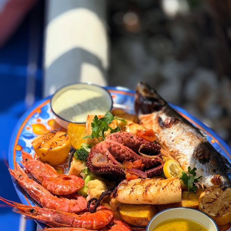 4 king prawns, one whoe seabass, octopus with vegetables, grilled calamari and baby potatoes